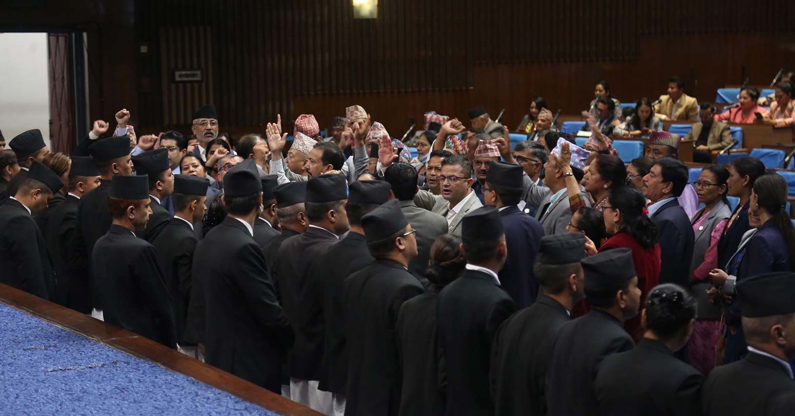 एमालेकी सांसद ज्वालाकुमारी साहलाई सभामुख देवराज घिमिरेले बोल्न समय दिएपछि सत्तापक्षका सांसदहरूले त्यसलाई अवरोध गर्ने रणनीतिका साथ उठेर विरोध गरेका थिए। सत्तापक्षका सांसदहरूले उठेपछि एमालेका सांसदहरूले वेल घेराउ गर्दै सरकार र सत्तापक्षविरुद्ध नाराबाजी गरेका छन्।