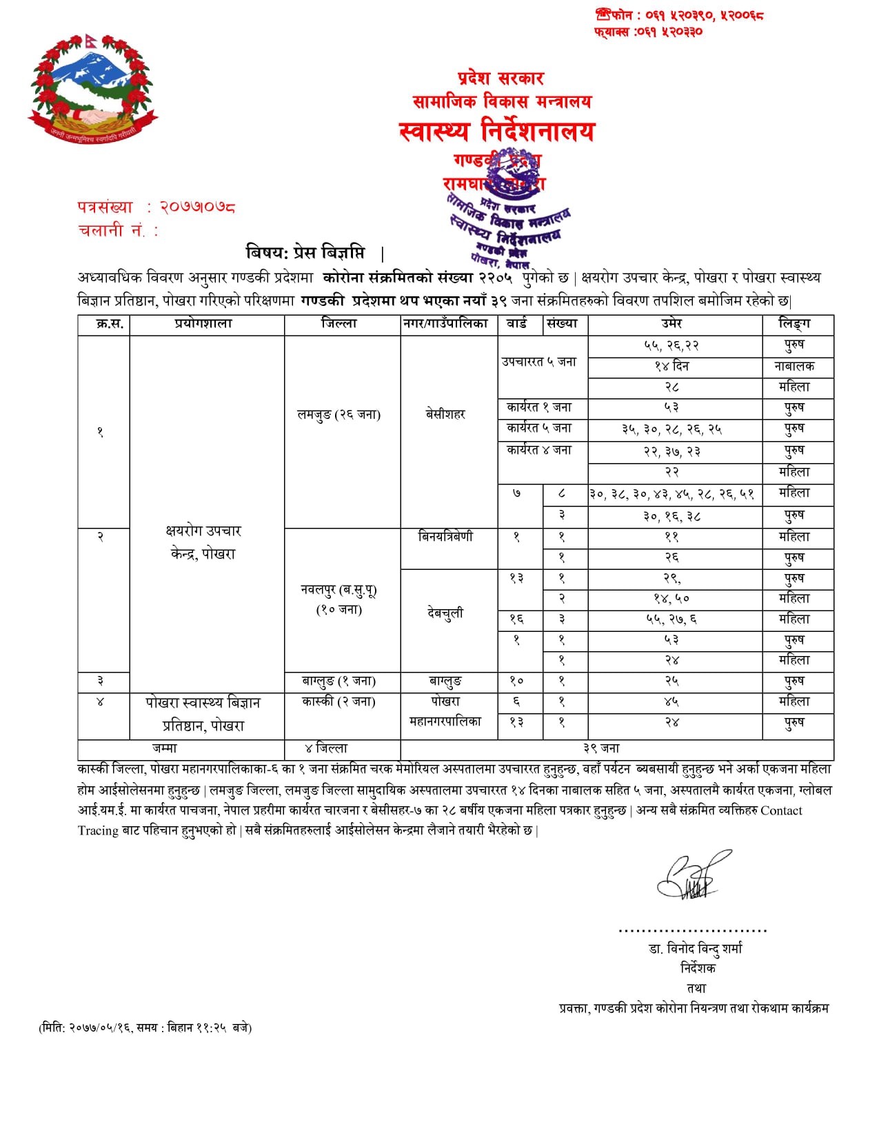 अध्यावधिक विवरण अनुसार गण्डकी प्रदेशमा कोरोना संक्रमितको कुल संख्या २२०५ पुगेको प्रदेश स्वास्थ्य निर्देशनालयले जनाएको छ ।