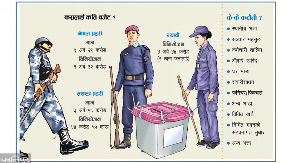 प्रहरीले साधारण खर्चतर्फ ३ अर्ब ७ करोड ५३ लाख ४९ हजार २ सय ५२ रुपैयाँ र पुँजीगततर्फ ६ अर्ब २१ करोड ६४ लाख ३ हजार १ सय रुपैयाँ माग गरेकामा अर्थले साधारणतर्फ ८९ करोड १२ लाख २८ हजार २ सय र पुँजीगततर्फ ४३ करोड ३७ लाख ५० हजार रुपैयाँ मात्रै विनियोजन गरेको छ । २०७४ को स्थानीय तह निर्वाचनमा ६५ हजारभन्दा बढी प्रहरी खटिँदा चालुतर्फ २ अर्ब २३ करोड ५० लाख २ हजार र पुँजीगततर्फ ३० करोड रुपैयाँ विनियोजन भएको थियो ।
