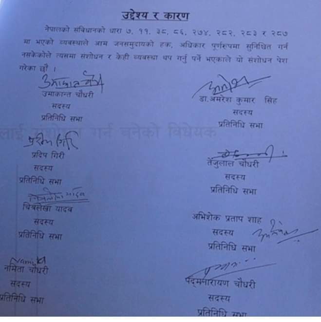 नेपाली कांग्रेसका सांसद तथा केन्द्रीय सदस्य उमाकान्त चौधरीले तत्कालिन पार्टी सभापति शेरबहादुर देउवाले २०७४ सालमा संसदमा पेश गरेको संविधान संशोधनको प्रस्तावलाई नैं मंगलबार प्रतिनिधिसभा सचिवालयमा दर्ता गराएको बताए ।