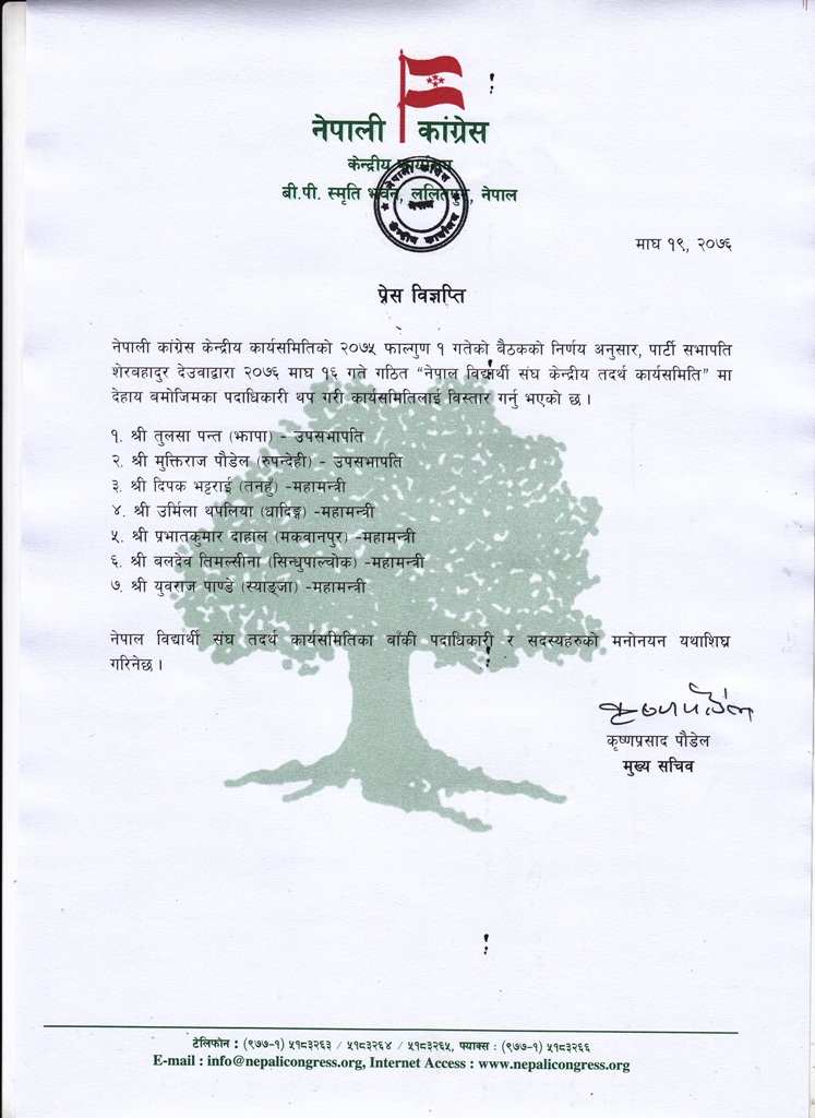 (काठमाडौं) – नेपाली कांग्रेसको भ्रातृ संगठन नेपाल विद्यार्थी संघको तदर्थ समितिमा दुई उपसभापति र ५ जना महामन्त्री गरी थप ७ जना मनोनित भएका छन् । कांग्रेसका सभापति शेरबहादुर देउवाले भ्रातृ संस्था नेवि संघमा दुई जना उपसभापति मनोनित गरेका हुन् ।