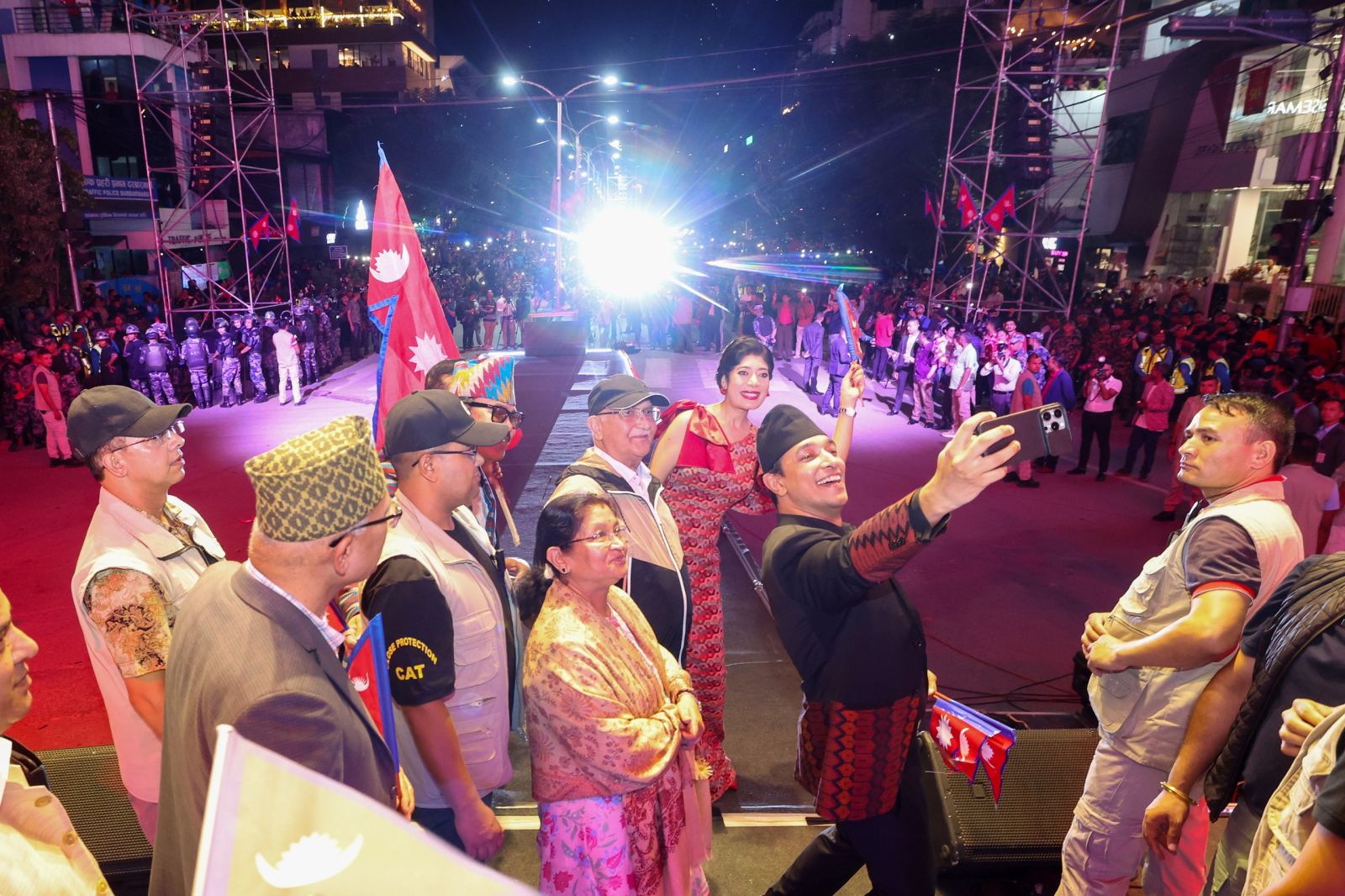पत्नी राधिका शाक्य र उपप्रधान एवं अर्थमन्त्री विष्णुप्रसाद पौडेल लगायतसँगै कन्सर्टमा पुगेका उनले त्यहाँ छोटो मन्तव्य राखेका थिए । स्टेजमा गएर राष्ट्रिय झण्डा फहराएपछि उनी फर्किएका थिए । गृहमन्त्री रमेश लेखक पनि कार्यक्रममा सहभागी भएका थिए ।उनीहरु करिब ५–१० मिनेट मात्र कन्सर्टमा सहभागी भए ।