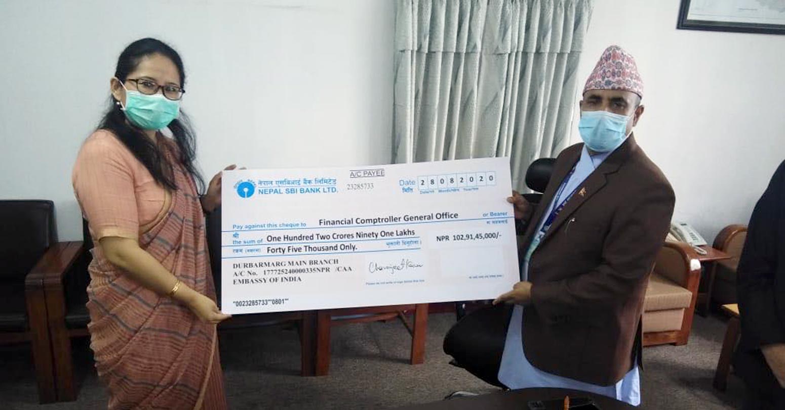 बिहबिार भारतीय दुतावासका नियोग उप–प्रमुख नामग्य खम्पाले अर्थ मन्त्रालयका सचिव श्शिशिर कुमार ढुङ्गानालाई भारत सरकारले आवास तथा विद्यालय पुनर्निर्माणका लागि गरेको प्रतिबद्धता अनुरुप नेरु १ अर्ब ५४ करोड अर्थात ९६ करोड भारतीय रुपैंयाको चेक हस्तान्तरण गरेकी छन् ।