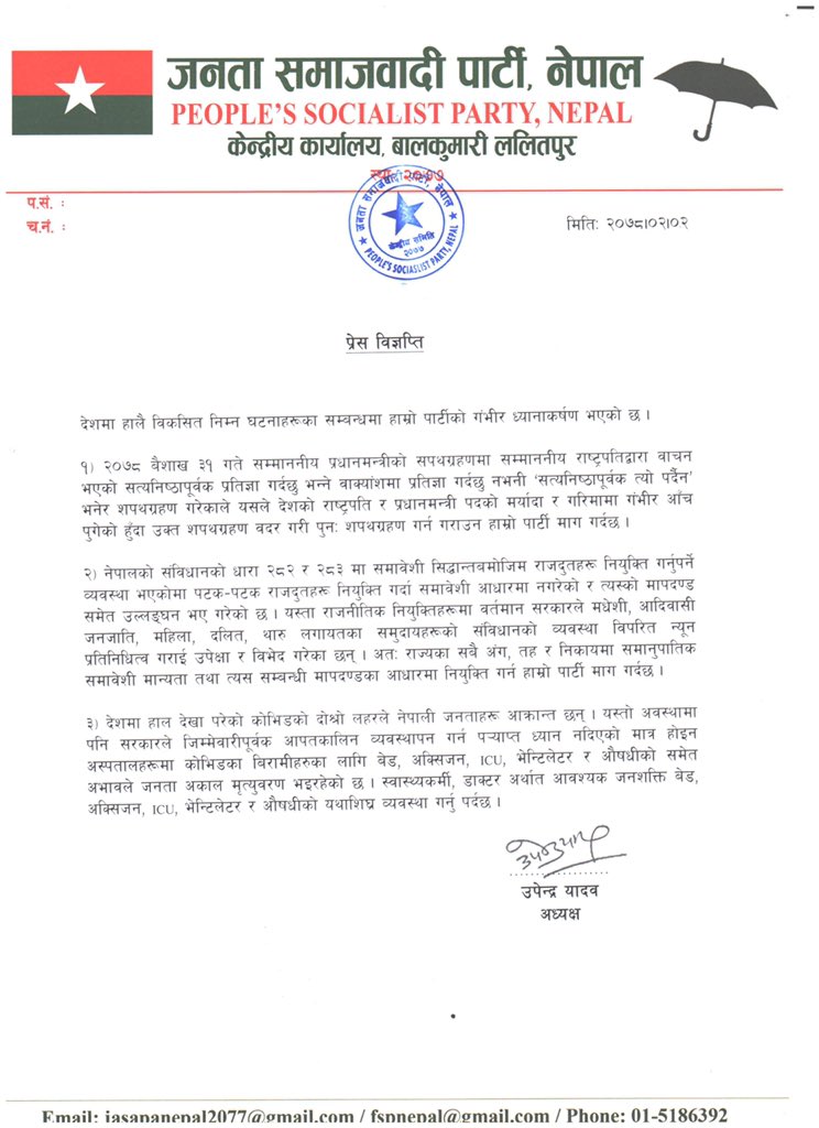 अध्यक्ष यादवद्वारा जारी विज्ञप्तीमा भनिएको छ-‘प्रधानमन्त्रीको शपथग्रहणमा सम्माननीय राष्ट्रपतिद्वारा वाचन भएको सत्य निष्ठापूर्वक प्रतिज्ञा गर्दछु भन्ने वाक्यांशमा प्रतिज्ञा गर्दछु नभनी सत्यनिष्ठापूर्वक त्यो पर्दैन भनेर शपथग्रहण गरेकाले यसले देशको राष्ट्रपति र प्रधानमन्त्री पदको मर्यादा र गरिमामा गम्भीर आँच पुगेको हुँदा उक्त शपथग्रहण बदर गरी पुनः शपथग्रहण गर्न गराउन हाम्रो पार्टी माग गर्दछ। ’