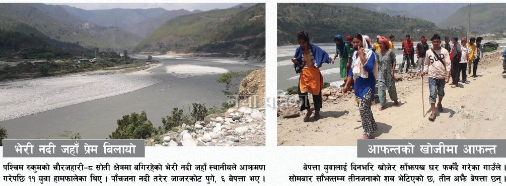 भेरी नदी जहाँ प्रेम बिलायो : पश्चिम रुकुमको चौरजहारी–८ सोती क्षेत्रमा बगिरहेको भेरी नदी जहाँ स्थानीयले आक्रमण गरेपछि ११ युवा हामफालेका थिए । पाँचजना नदी तरेर जाजरकोट पुगे, ६ बेपत्ता भए ।