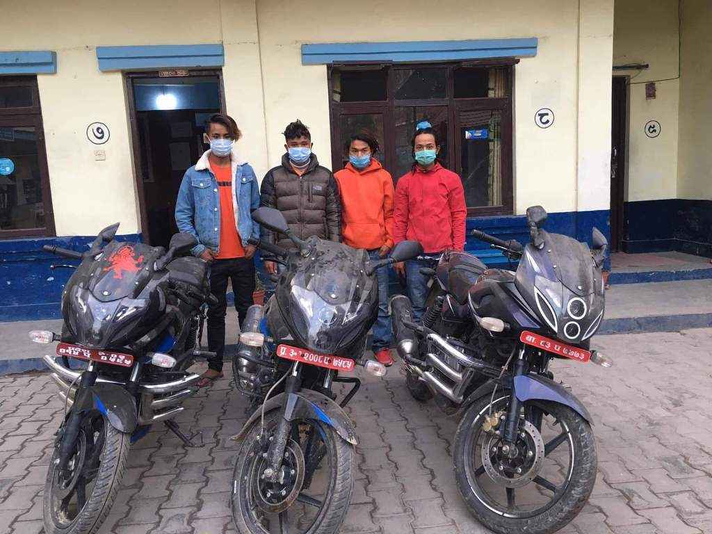 महानगरीय प्रहरी वृत्त जगातीबाट खटिएको प्रहरीले चाँगुनारायण नगरपालिका-९ ताथलीमा जाँच गर्दा चोरी भएको बा.८३ प ७७७३ नम्बरको मोटरसाइकल सहित सोनाम र फुर्बालाई बिहीबार राति तथा प्र.३-०२-००८ प ७५८५ र प्र.३-०२-०१४ प ०५९४ नम्बरका मोटरसाइकल सहित सूर्यविनायक नगरपालिका-८ सूर्यविनायकबाट अन्य २ जनालाई शुक्रबार दिउँसो पक्राउ गरेको हो ।