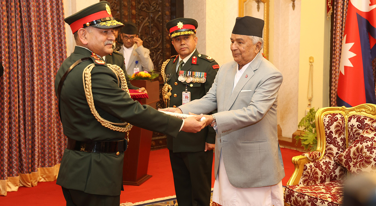 राष्ट्रपति पौडेलबाट भारतीय सेनाध्यक्ष द्विवेदीलाई मानार्थ महारथीको उपाधि प्रदान