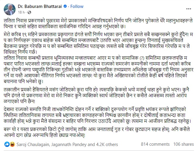 भट्टराईले भनेका छन्, ‘देशमा राज्यको सम्पत्ति निजी लाभको निम्ति दोहन गर्ने र शक्तिको दुरुपयोग गर्ने प्रवृत्ति भयंकर रूपले झागिएको स्थितिमा ललिता निवासलगायत सबै भ्रष्टाचारका काण्डहरूको निष्पक्ष छानबिन होस् र दोषीलाई कडाभन्दा कडा कारबाही होस् भन्ने कुरा मैले संसदमा र बाहिर पनि निरन्तर उठाउँदै आएको छु। त्यसमा म आजीवन प्रतिबद्ध रहनेछु।’
