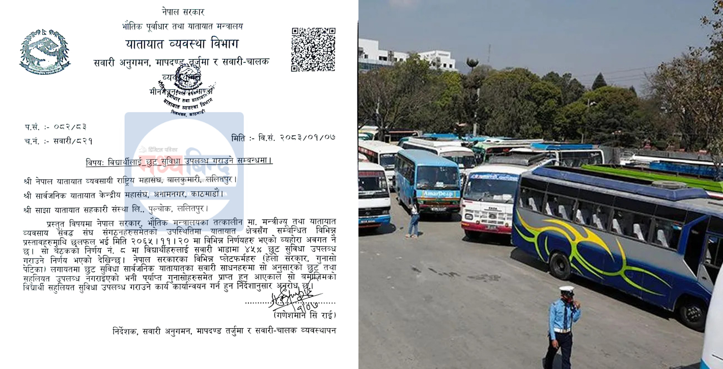गाडी भाडामा विद्यार्थीलाई अनिवार्य ४५ प्रतिशत छुट दिन सरकारको निर्देशन