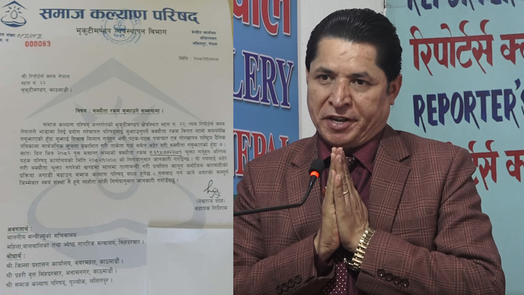 क्लवलाई पठाएको परिषदको ताकेतापत्रमा उल्लेख छ–समाज कल्याण परिषद् अन्तर्गतको भृकुटीमण्डप क्षेत्रस्थित स्टल नं.२२, त्यस रिपोर्टर्स क्लब नेपालले भाडामा लिई प्रयोग गरेबापत परिषद्लाई बुझाउनुपर्ने बक्यौता रकम विगत लामो समयदेखि नबुझाएको हुँदा बुझाई हिसाव मिलान गर्नुहुन भनी पटक–पटक पत्राचार एवं गोरखापत्र राष्ट्रिय दैनिक पत्रिकामा सार्वजनिक सूचना प्रकाशित गरी ताकेता गर्दा समेत अटेर गरी बक्यौता नबुझाएको हुँदा ७ (सात) दिनभित्र २०८२ पुस मसान्तसम्मको बक्यौता रकम रु ६९ लाख ५७ हजार ७ सय २२ रुपैयाँ ८१ पैसा चुक्ता गर्नुहुन अन्तिम पटक परिषद् कार्यालयको मिति २०८२ माघ ८ को निर्णयानुसार जानकारी गराइन्छ ।