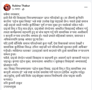 काठमाडौँ । उपसभामुख रुबिना ठाकुरले दाइजो लेनदेन हुने विवाहमा सहभागी नहुने बताएकी छन् । सामाजिक सञ्जालमा लेख्दै उनले आफूलाई विवाहका धेरै निमन्त्रणापत्र प्राप्त भइरहेको र तीमध्ये कुनै पनि कार्डमा ‘दहेजमुक्त विवाह’ भन्ने उल्लेख भएको देख्न नपाइएको बताएकी छन् ।