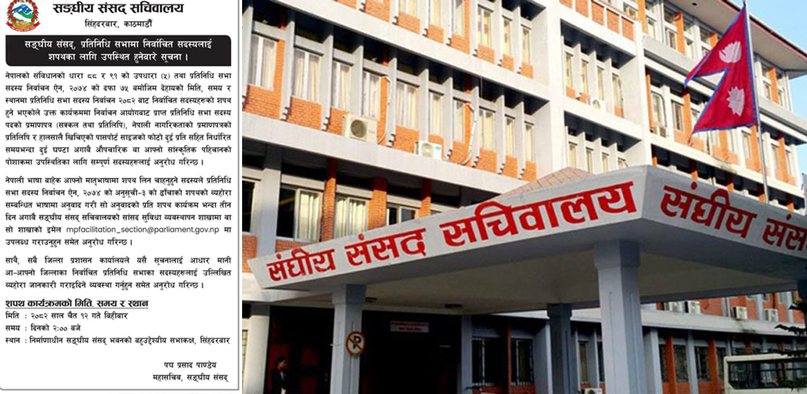 काठमाडौं । संघीय संसद सचिवालयले प्रतिनिधिसभाका नवनिर्वाचित सांसदलाई शपथमा उपस्थित हुन सार्वजनिक सूचना निकालेको छ । सांसदहरूको शपथ यही चैत १२ गते बिहीबार दिउँसो २ बजे सिंहदरबारस्थित निर्माणाधीन संघीय संसद् भवनको बहुउद्देश्यीय सभाकक्षमा हुनेछ ।