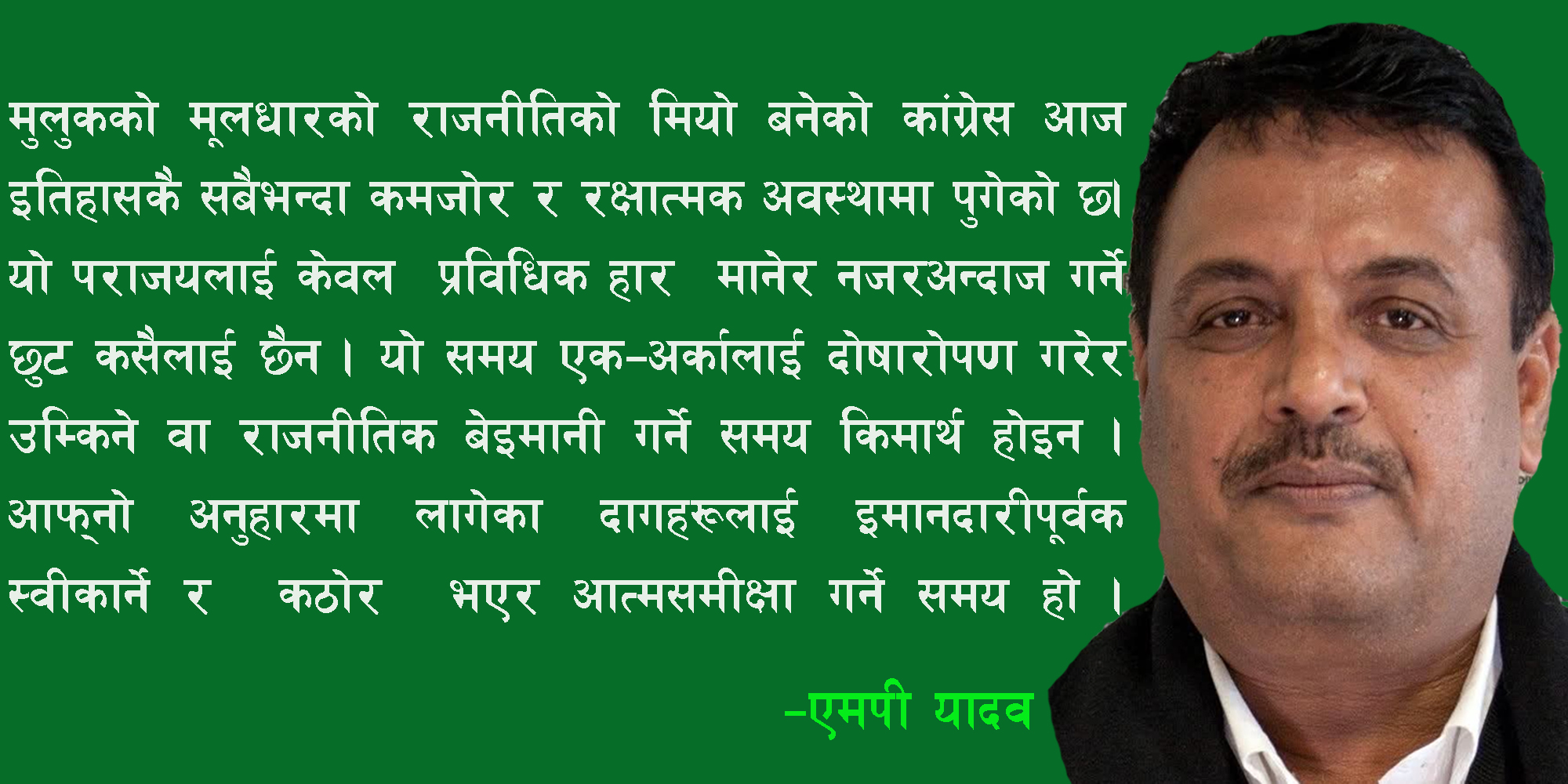 यो पराजयलाई केवल प्रविधिक हारु मानेर नजरअन्दाज गर्ने छुट कसैलाई छैन। यो समय एक(अर्कालाई दोषारोपण गरेर उम्किने वा राजनीतिक बेइमानी गर्ने समय किमार्थ होइन। बरु, यो त ऐना अगाडि उभिएर आफ्नो अनुहारमा लागेका दागहरूलाई इमानदारीपूर्वक स्वीकार्ने र तिनलाई सफा गर्ने कठोर आत्मसमीक्षाको समय हो।