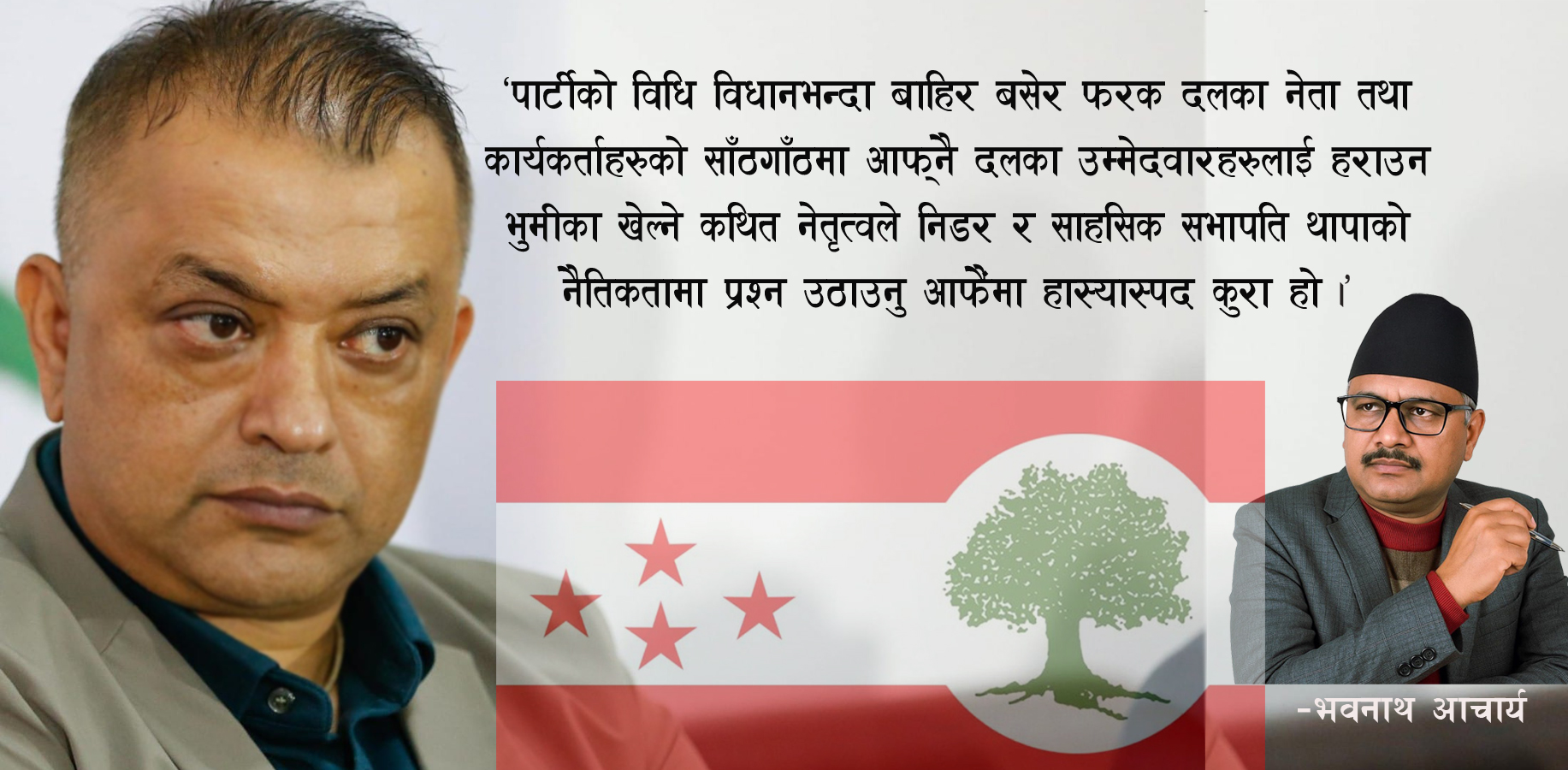 पार्टीको विधि विधानभन्दा बाहिर बसेर फरक दलका नेता तथा कार्यकर्ताहरुको साँठगाँठमा आफ्नै दलका उम्मेदवारहरुलाई हराउन भुमीका खेल्ने अनैतिक कथित नेतृत्वले एउटा निडर र साहसिक नेतृत्व दिई रहेका सभापति थापाको नैतिकतामा प्रश्न उठाउनु आफैमा हास्यस्पद कुरा हो । पार्टीलाई लामो समयदेखि आप्mनो नीजि सम्पत्तीको रुपमा कव्जा गर्दै आई रहेको समुह न समयानुकुल सक्षम नेतृत्व दिन सफल भयो, न नयाँ नेतृत्वलाई स्वीकार्न नै तयार छ ।