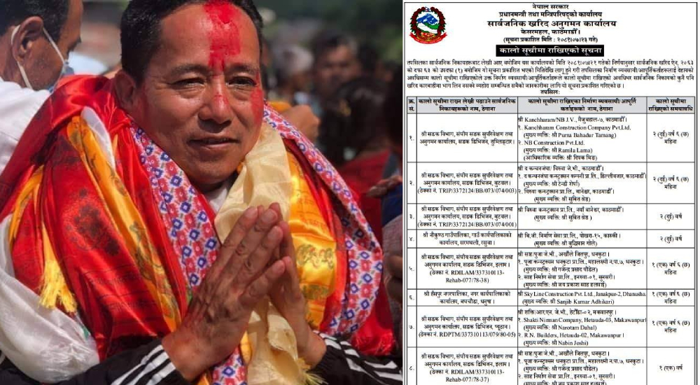 यो कम्पनीका मुख्य व्यक्ति बैजनाथ यादव हुन् । यसैगरी रौतामाई गाउँपालिका उदयपुरको सिफारिसमा सिङ्दान सप्लायर्स एण्ड कन्स्ट्रक्सन प्रालि धनुषा र विशाल निर्माण सेवा सिन्धुपाल्चोक एक–एक वर्षका लागि कालोसूचीमा परेका छन् । सिङ्दान सप्लायर्स एण्ड कन्स्ट्रक्सन प्रालिका मुख्य व्यक्ति रमेश कुमार सिङ्दान हुन् भने विशाल निर्माण सेवाका मुख्य व्यक्ति श्याम कुमार गलान हुन् ।