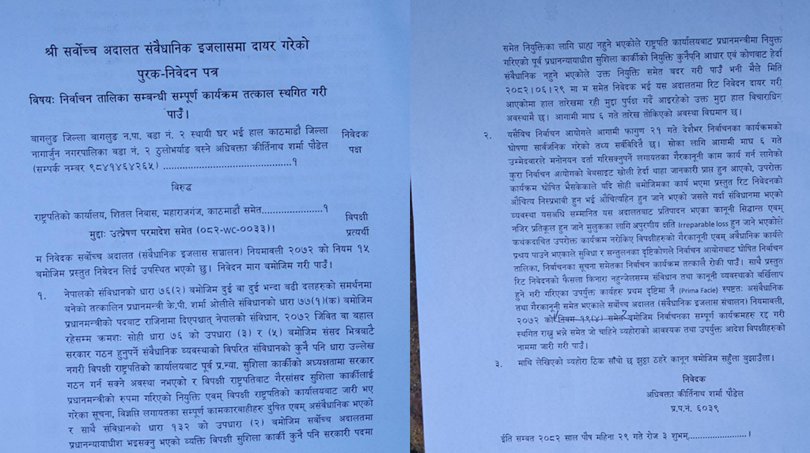 काठमाडौँ । आगामी फागुन २१ गते हुने प्रतिनिधिसभा निर्वाचनको लागि माघ ६ गते हुन लागेको प्रत्यक्षतर्फको मनोनयन पत्र रोक्न माग गर्दै सर्वोच्च अदालतमा रिट पेस भएको छ । अधिवक्ता कीर्तीनाथ शर्मा पौडेलले राष्ट्रपति कार्यालय र प्रधानमन्त्री कार्यालयलाई विपक्षी बनाएर मंगलबार रिट पेस गरेका हुन् ।उनले निर्वाचन तालिका सम्बन्धी सम्पूर्ण कार्यक्रम तत्काल स्थगितको माग गरेका छन् । उनले रिटमा निर्वाचन प्रणालीतर्फ आगामी माघ ६ गते बिहान १० देखि बेलुका ५ बजेसम्म निर्वाचन अधिकृतको कार्यालयमा उम्मेदवारको मनोनयनपत्र दर्तादेखि निर्वाचन प्रक्रियाको सबै काम स्थगित गराउन माग गरेका छन् ।