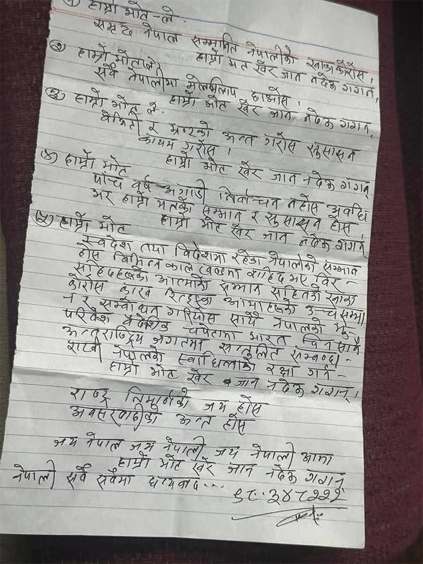 चिठीमा हाम्रो मतले समृद्ध नेपाल र सम्मानित नेपालीको खाका कोरोस्, सबै नेपालीमा मेलमिलाप छाओस् र राष्ट्रिय एकता मजबुत होस्, देशमा व्याप्त बेथिति र भ्रष्टाचारको अन्त्य होस् र सुशासन कायम गरियोस्, पाँच वर्षको अवधिभर निर्वाचित प्रतिनिधिहरूले जनमतको सम्मान गरुन् र बारम्बारको अस्थिरता नहोस्, सहिदहरूको सपना साकार पारियोस् । नेपालको भू–परिवेश र अन्तर्राष्ट्रिय जगतमा भारत र चीनसँगको सम्बन्ध सन्तुलित राखियोस् र नेपालको स्वाधीनताको रक्षा गरियोस् भन्ने उल्लेख छ । चिठीको अन्त्यमा ‘जय नेपाल, जय नेपाली, जय नेपाली आमा’ भन्दै ‘राष्ट्र निर्माणको जय होस्, अवसरवादीको अन्त्य होस्’ भन्ने नारा लेखिएको छ ।