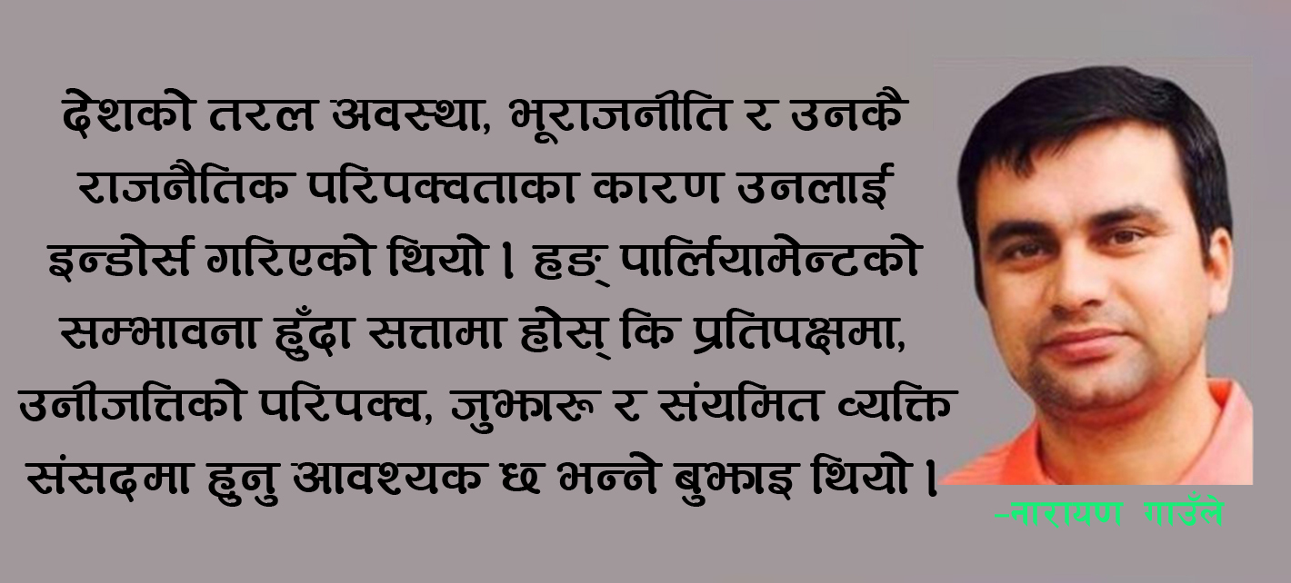देशको तरल अवस्था, भूराजनीति र उनकै राजनैतिक परिपक्वताका कारण उनलाई इन्डोर्स गरिएको थियो । हङ् पार्लियामेन्टको सम्भावना हुँदा सत्तामा होस् कि प्रतिपक्षमा, उनीजत्तिको परिपक्व, जुझारू र संयमित व्यक्ति संसदमा हुनु आवश्यक छ भन्ने बुझाइ थियो । यो समर्थन प्रेम या बिहेजस्तो एउटालाई यस र अरू सबैलाई नो भन्ने खालको थिएन । उनका प्रतिद्वन्द्वी अमरेश कुमारभन्दा गगन योग्य हुन् भन्ने आज पनि लाग्छ तर जनताको निर्णयभन्दा माथि अरू केही हुँदैन ।