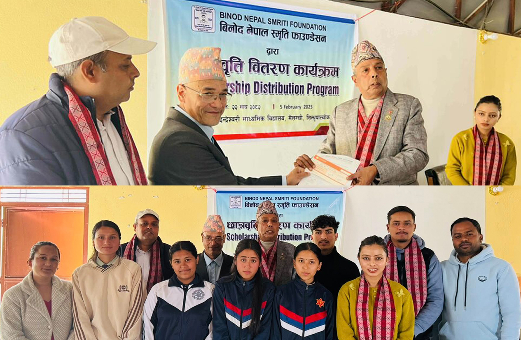 मेलम्ची (सिन्धुपाल्चोक) । ‘विनोद नेपाल स्मृति फाउण्डेशन’ ले सिन्धुपाल्चोक जिल्लाको मेलम्चीस्थित इन्द्रेश्वरी माध्यमिक विद्यालयमा अध्ययनरत ५ जना जेहेन्दार विद्यार्थीहरूलाई छात्रवृत्ति प्रदान गरेको छ । सिभिल इन्जिनियरिङ संकायमा अध्ययनरत विद्यार्थीहरूलाई सो फाउन्डेसनले उनीहरूको शैक्षिक निरन्तरतामा सहयोग पुर्याउने उद्देश्यले छात्रवृत्ति प्रदान गरेको जनाएको छ । यस वर्ष छात्रवृत्ति प्राप्त गर्ने विद्यार्थीहरूमा कक्षा १० मा अध्ययनरत अनुसा पुरी, प्रतिभा चालिस, हिमानी चालिसे, सन्दिप गिरी र मानवी पुरी रहेको समेत फाउन्डेसनका अध्यक्ष डाक्टर गंगादत्त नेपालले बताएका छन् ।