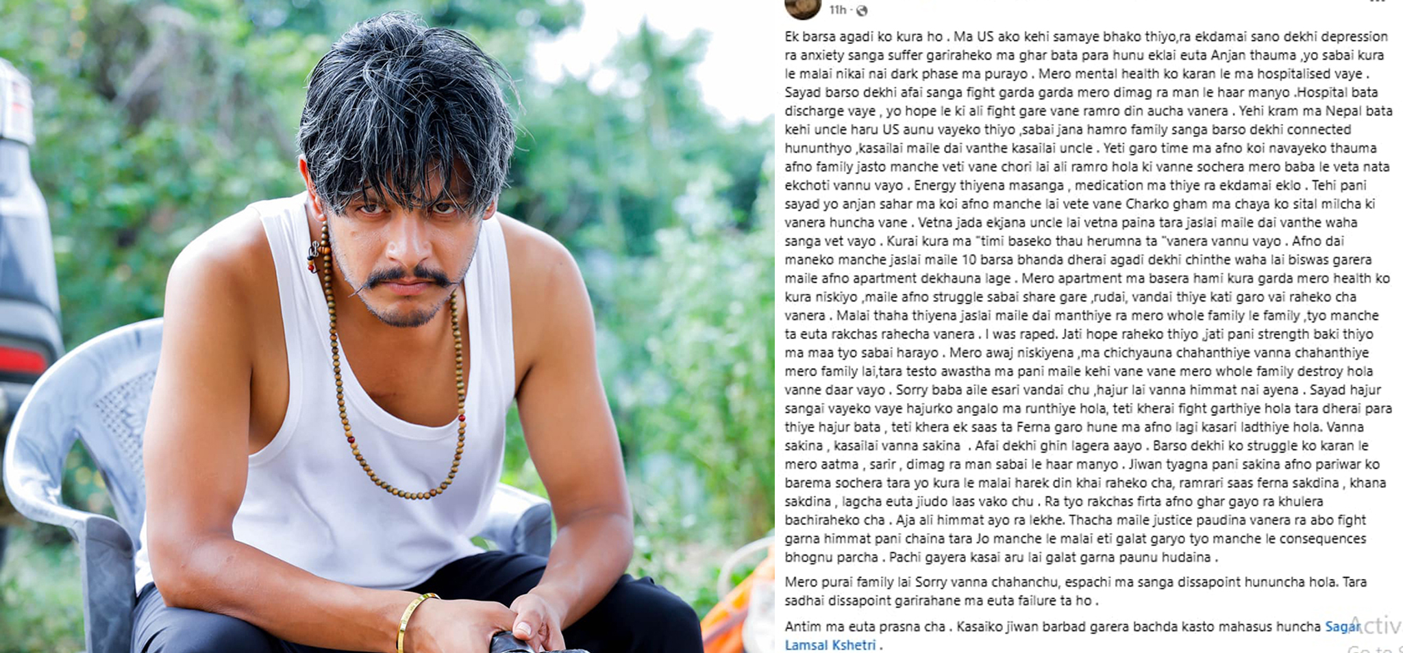 कलाकार लम्सालले आफ्नो जीवन बर्बाद पारेको ती युवतीको गुनासो छ । परिवारसँग माफी माग्दै भनेकी छन्, ‘आज अलि हिम्मत आयो र यो लेखेँ, मलाई थाहा छ, मैले न्याय पाउँदिनँ, र अब लड्ने हिम्मत पनि छैन, तर जसले मसँग यस्तो गलत गर्‍यो, उसले आफ्नो कर्मको परिणाम भोग्नैपर्छ, भविष्यमा उसले अरू कसैसँग यस्तो गर्न नपाओस् ।’ स्मरण रहोस्, विभिन्न म्युजिक भिडियोमा मोडलिङसमेत गरेका कमेडियन लम्सालले एक वर्षअघि झापाकी स्नेहा दंगालसँग काठमाडौँको चावाहिस्थित दियो पार्टी प्यालेसमा धुमधामले बिहे गरेका थिए ।